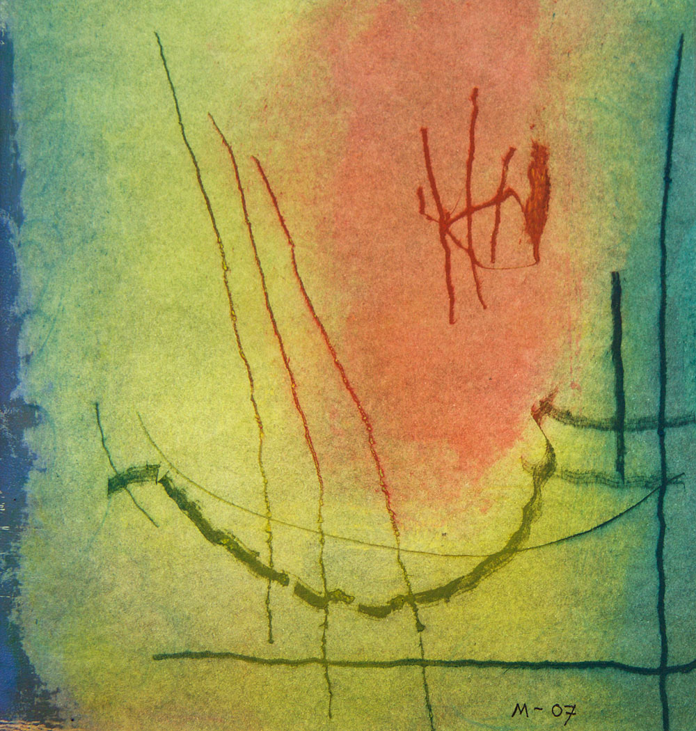 Linien, Zeichen und Symbole stehen deutlich im Vordergrund. Die berufliche Prägung ist noch nicht überwunden. Sie ist auch bei späteren Arbeiten oft spürbar. Die Bildformate bleiben weitgehend klein.